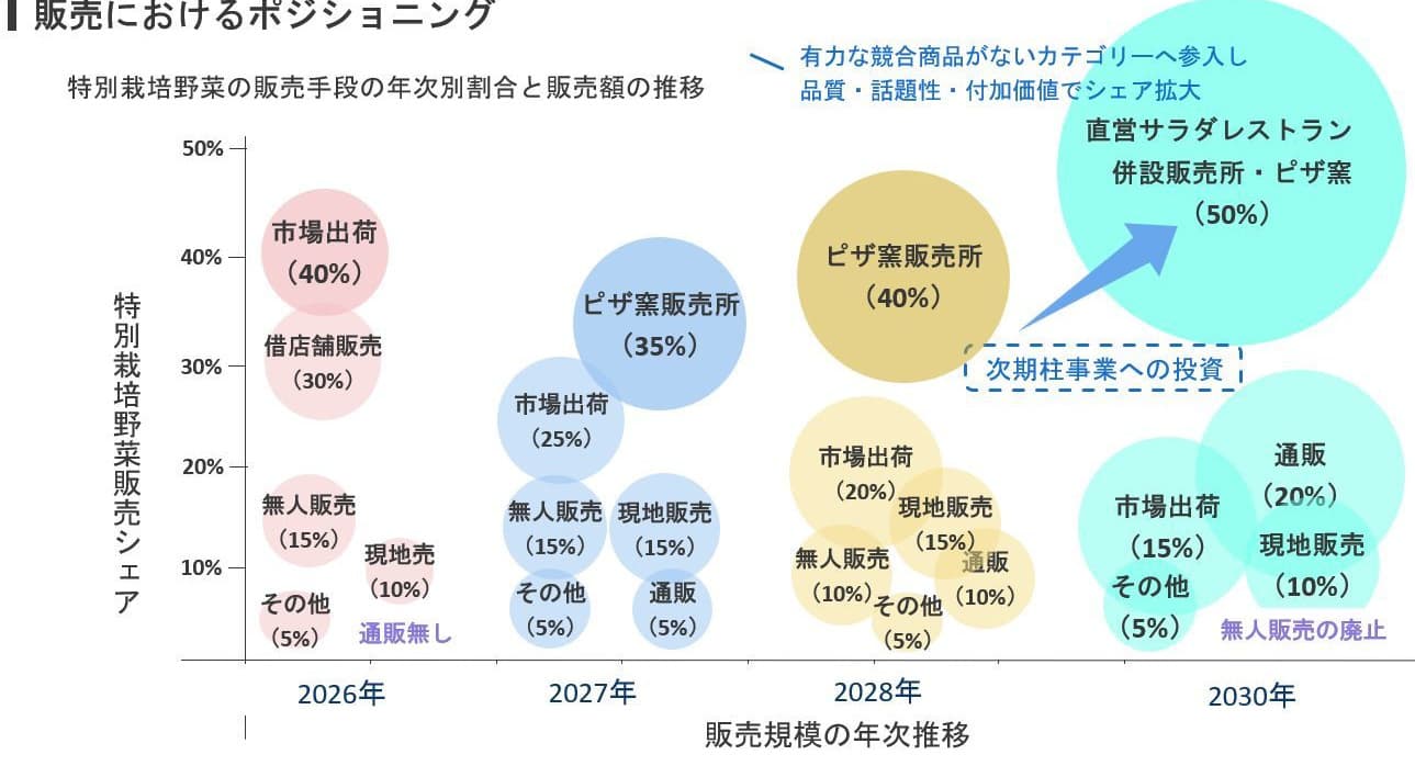 野菜の販売においては、、農場販売、無人販売、既存店舗への委託、市場出荷、ネット通販、直売店の開設などを順次取り入れる。