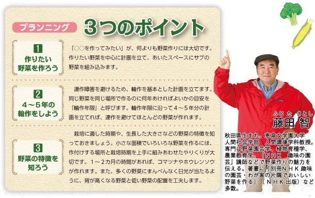 作りたい野菜の栽培時期を知ったうえで、畑を効率よく使えるような組みあわせを考えます。また、野菜によって草丈が違うので、多くの野菜にまんべんなく日光が当たるように配置します。